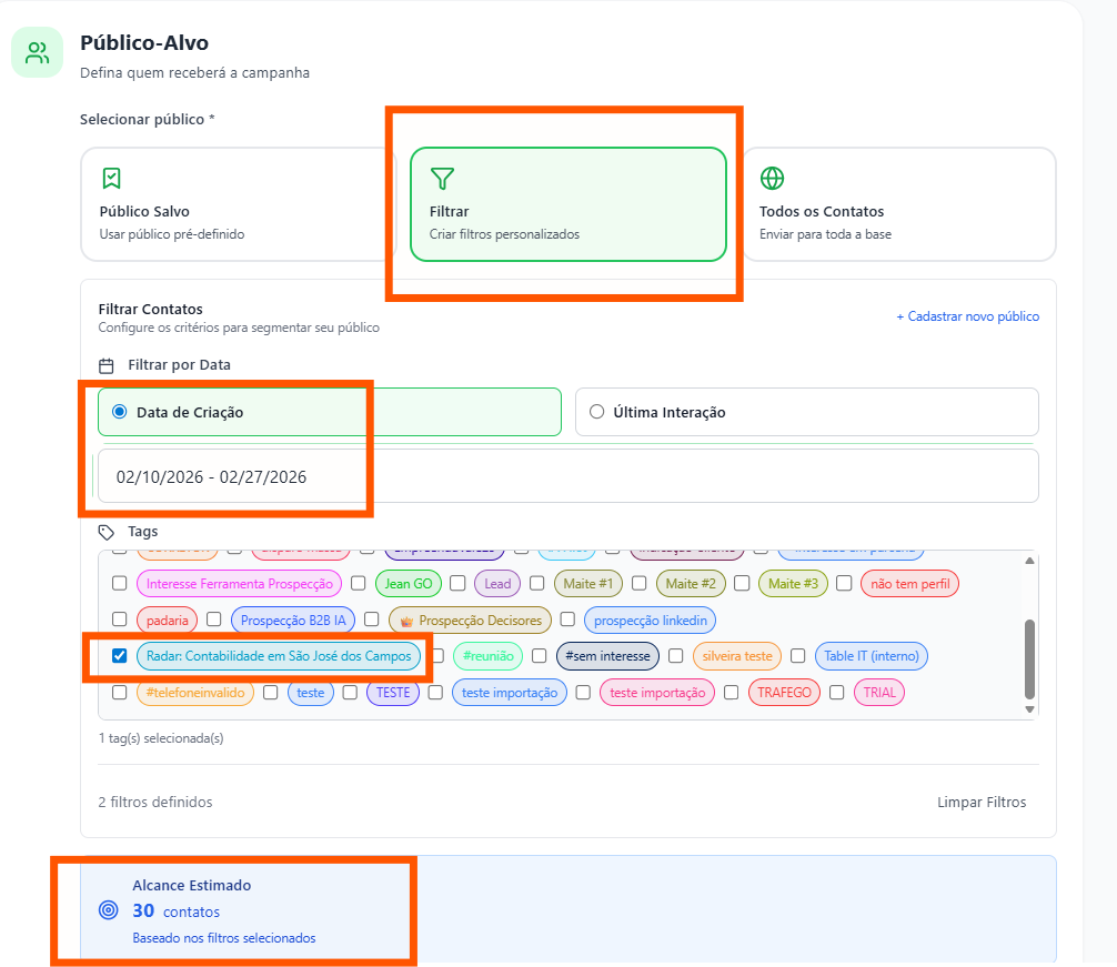 Configurar a CampanhaSelecione o público criado ou aplique o filtro (Tag + Data)