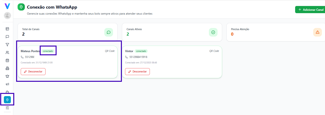 Menu lateral → Conexão WhatsApp