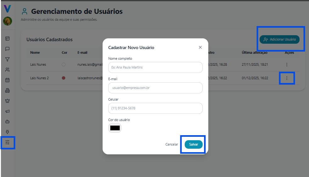Acesse Configurações > Administrar Usuários > Adicionar Usuário.